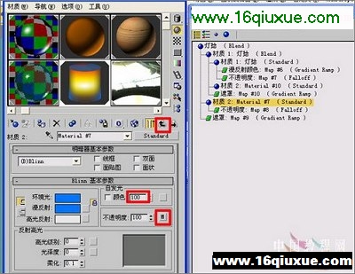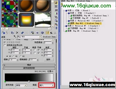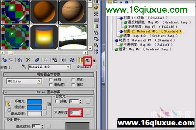 再次打开材质1~~~在漫反射通道贴一个渐变坡度~~~在不透明通道贴个衰减